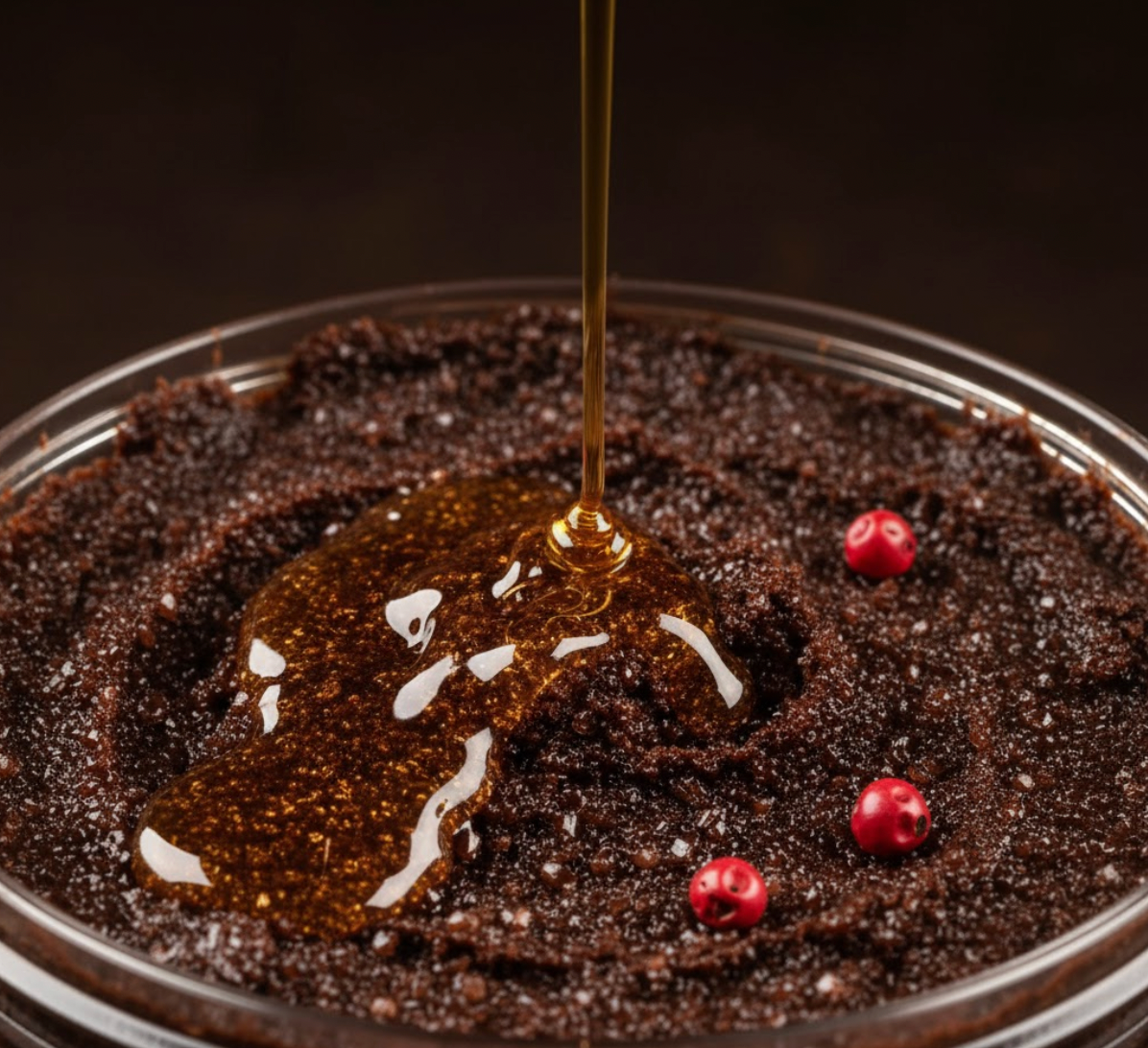 Gommage Gourmand Cacao (200 ml) : Préparation. Gommage Musc Tahara enrichi en Poudre de Cacao et Poivre Rose. Pour une peau stimulée et parfumée avant la brume.